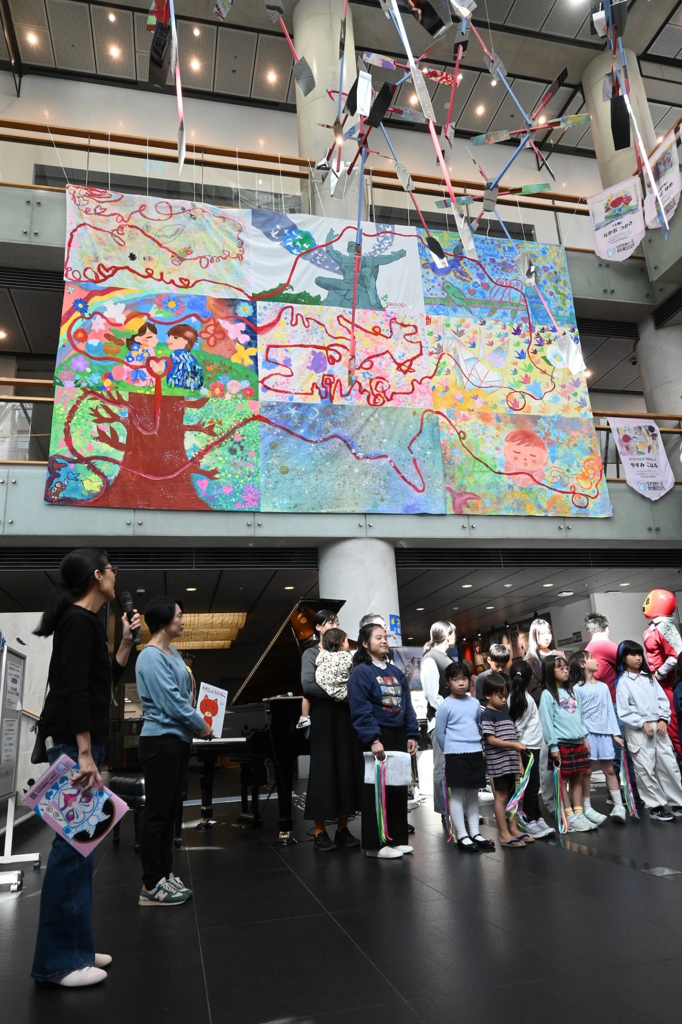 9つを絵を繋ぎ合わせた大きな「平和の絵」の完成記念。